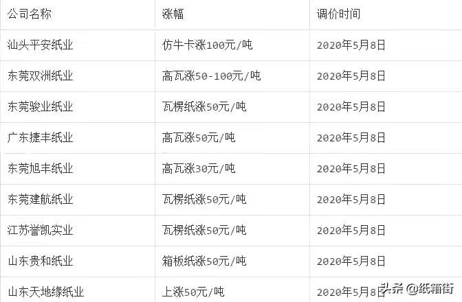 而紙板廠方面,也有個(gè)別企業(yè)帶頭拉漲!汕頭市萬騰紙業(yè)宣布從5月7日起三層紙板每平方上調(diào)0.03元,四層每平方上調(diào)0.04元,五層每平方上調(diào)0.05元,七層每平方上調(diào)0.07元。