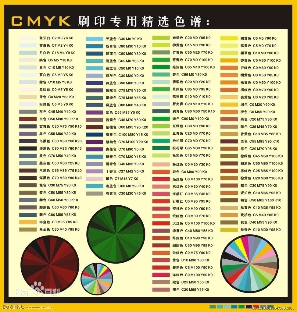 1、CMYK——即青、洋紅(品紅)、黃、黑四種色彩,每種顏色數(shù)值為0-100,在印刷中通??捎蛇@四種色彩組合成成千上萬種顏色,最典型的就是畫冊(cè)和彩色宣傳單。