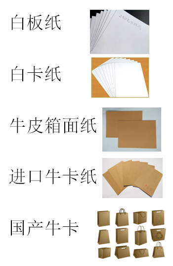紙袋,信封。此外還有白卡紙、金銀卡紙。